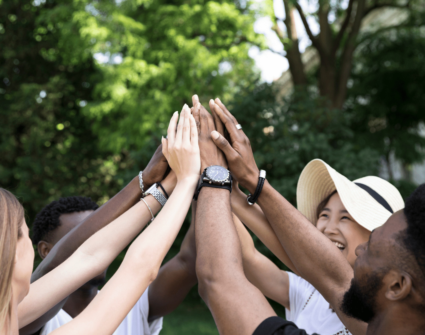Group of people raising hands together